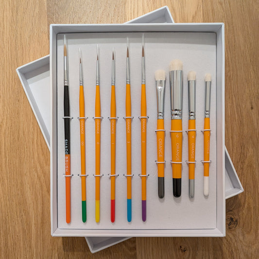 Nope, it's all about keeping costs down so your hobby quest is cheaper. No silly wooden boxes and colourful cardboard tubes here. Just brushes in a padded envelope!